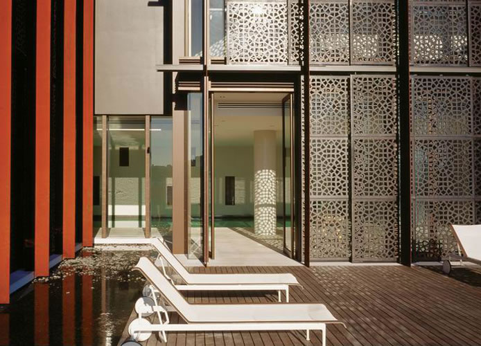 The Project includes three different facilities. The Aurora day spa, the pool and deck for hotel guests and spa patrons and a multifunction space associated with the hotel. The building consists of two zones with entry to both areas via the existing hotel foyer staircase. At arrival the two zones are screened by a mottled glass water wall; to one side is the spa and on the other side is the public area with the pool, function room and terrace leading from it. The two rectangular blocks were divided to articulate the two functions and separated by a water feature which is recessed into the building and reflected in plan and elevation. The outer skin was designed to provide privacy, maximize light, and be flexible. The core ten fins provide vertical division and the moving screens provide a shading web casting a patterned ambience internally.....more