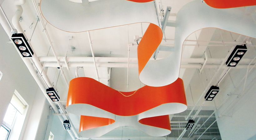 The Nestlé Cafeteria is a room extended on the roof terrace as a winter garden. It has a beautiful view, but the biggest problem is too much sunlight. We were inspired by the grape trellis of the Xinjiang minorities, where the people enjoy the cool in high summer, sitting on carpets and served food and wine; this links exactly with Nestle as a food company. In the same way we make the ceiling fully hanged with layers of plexi-glass leaves as sunshade, to provide a nice space to escape.......more