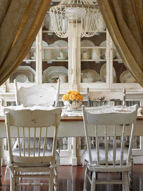 Frame an all-white room with doorway curtains that make the space look like a secret destination revealed. Gather a group of similar scale chairs in shades of white around the dining table for a one of-a kind set that's anything but predictable. The massive flea market apothecary cabinet, with its dark back, creates a dramatic display space for the white ironstone collection.